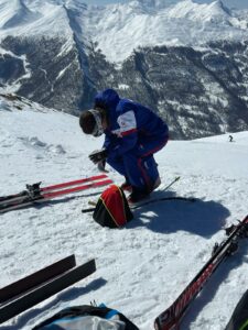 Ludivine qui a intégré l’équipe de France B cette année après avoir raccroché les skis pour les études, avait tout à apprendre et venait acquérir de l’expérience avec l’utilisation des tenues et matériels spécifiques.